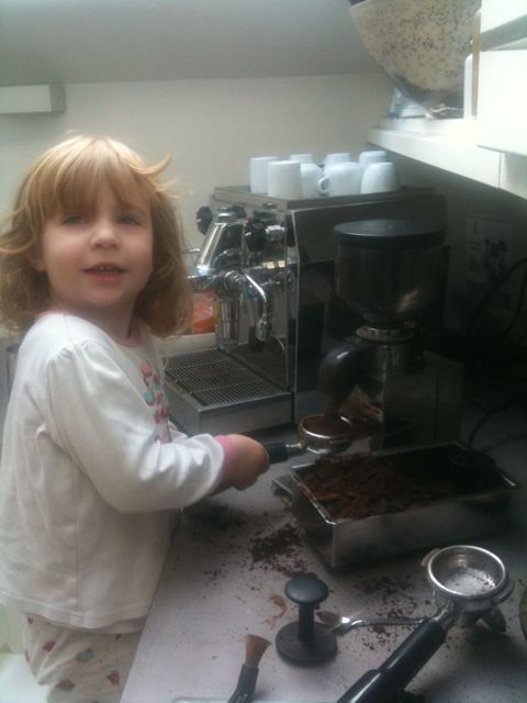 Ganz schön kompliziert bei uns Kaffee zu machen. Aber mittlerweile kann ich es auch: Kaffeesieb putzen, Kaffee mahlen – dann auf die Maschine drehen (da hilft mir Papa). Dann Milch schäumen. Die warme Kaffeetasse bring ich der Mama dann meist ans Bett, sonst steht sie gar nicht auf…