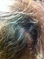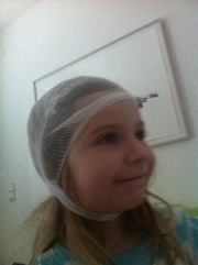 Eigentlich wollten wir auf den Christkindlmarkt gehen, da bin ich runter geplumpst und hab mir den Kopf aufgeschlagen. Mama, Papa und Lanqi, die gerade Besuch war, sind dann sofort in SMZ Ost gefahren. Die haben dann mit einem Kleber die Haut wieder zusammengepickt. Jetzt darf ich die Haare nicht waschen und muss in der Nacht ein Netz tragen.